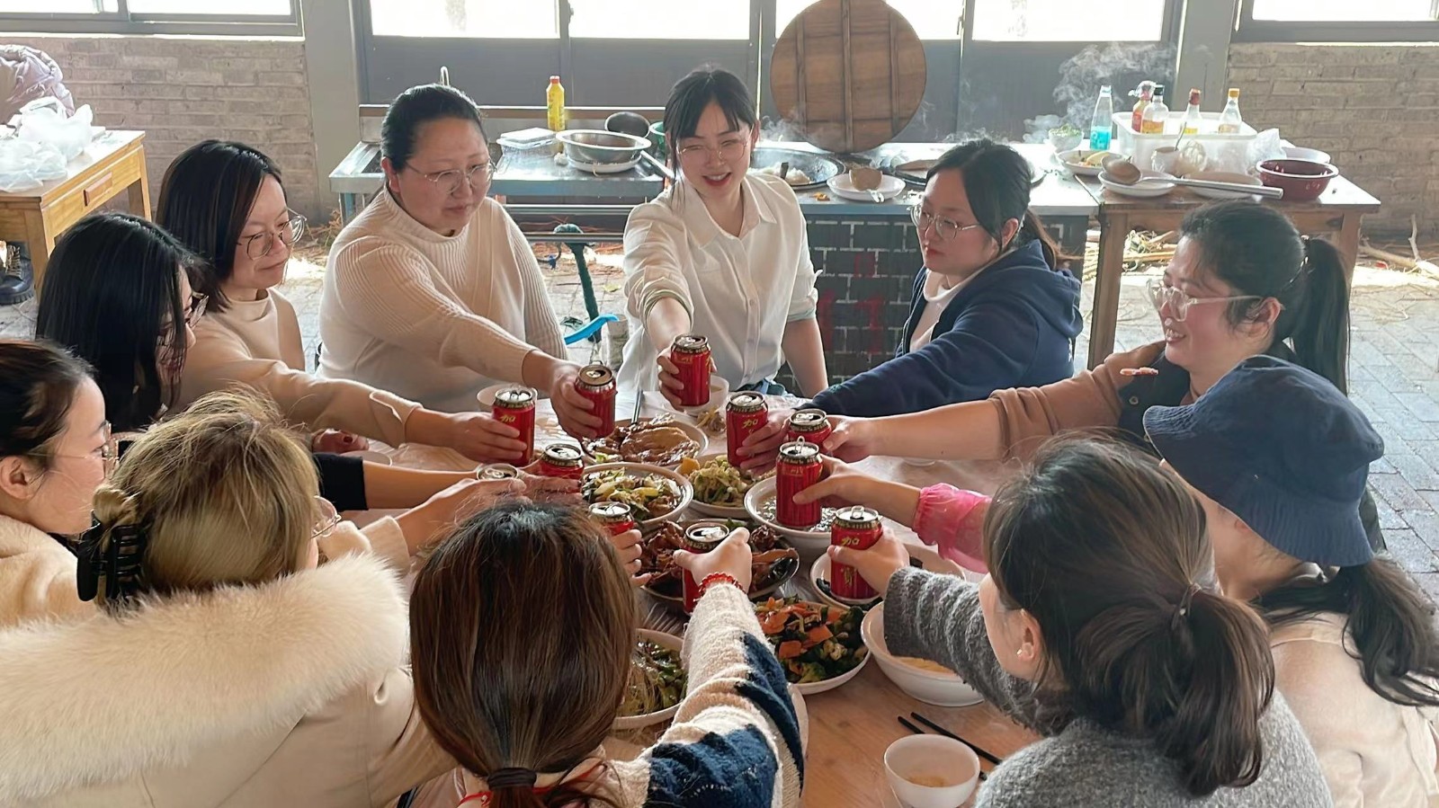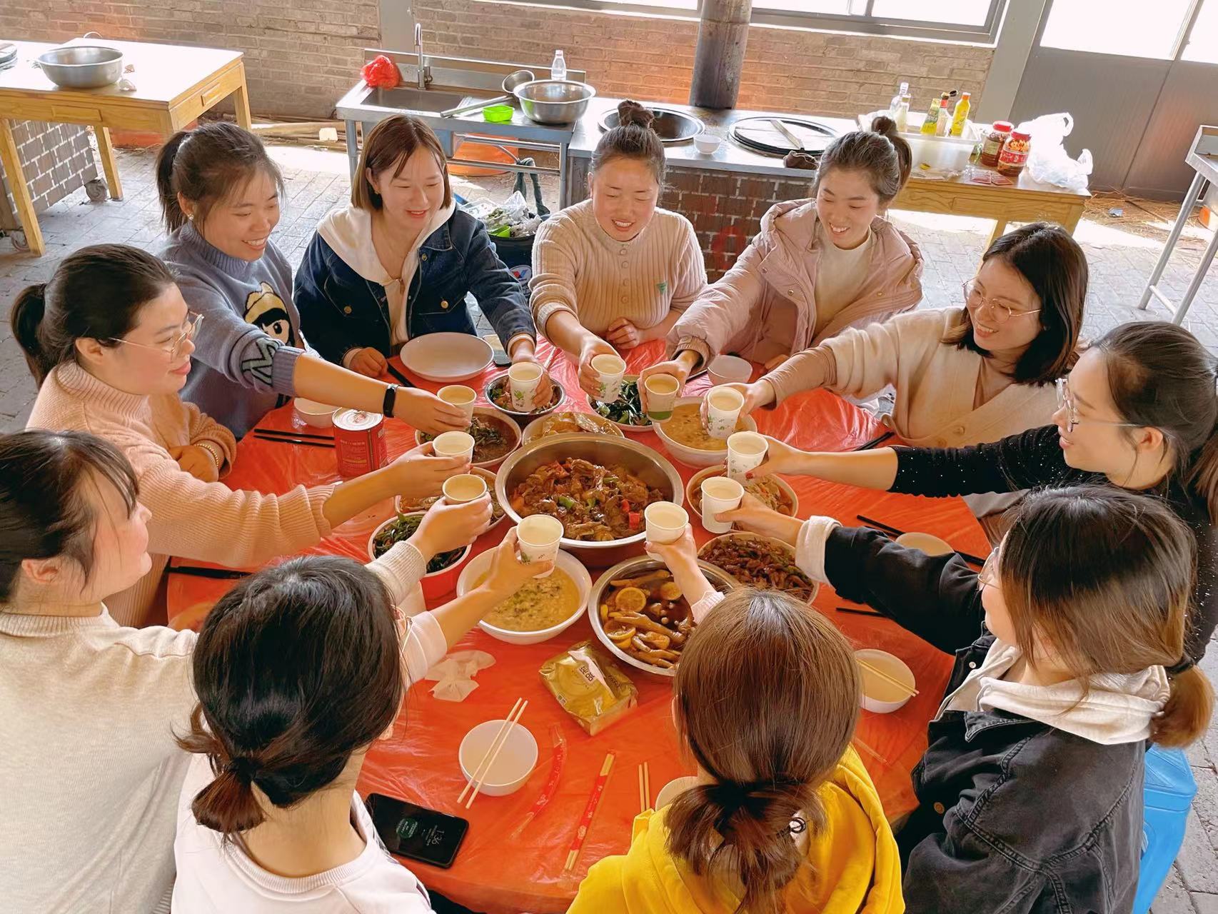 不一會,一桌桌豐盛的家常菜做好了,大家共同舉杯,共祝節日快樂,享受幸福時刻。